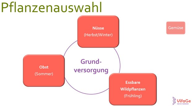 Der Aufwand rund um die Produktion von Nüssen, Früchten, Gemüsen und Hülsenfrüchten unterscheidet sich sowohl zwischen den benannten Gruppen als auch hinsichtlich der Arten und Sorten innerhalb dieser Gruppen. Nussgehölze lassen sich mit wenig Aufwand in unsere Landschaft integrieren. Einmal gepflanzt, produzieren sie große Mengen über lange Zeit. Ähnliches gilt für Obstgehölze, sofern der Pflegeschnitt vernachlässigbar ist. Da also sowohl die Produktion von Nüssen als auch von Obst verhältnismäßig wenig arbeitsintensiv ist, können wir beide Gruppen leicht im kostenlosen VifaGe® Angebot einbinden. Dies gilt jedoch nicht für Gemüse und Hülsenfrüchte, denn bei ihnen handelt es sich vorwiegend um einjährige Pflanzen, deren Anbau arbeitsintensiv ist. Der Anbau und die investierte Arbeit sollten also entsprechend entlohnt werden. Da Gemüse jedoch eine grundlegende Rolle in unserer Ernährung spielen, werden sie ersetzt durch die dritte Gruppe im VifaGe® Gesamtkonzept: “Essbare Wildpflanzen und Kräuter”. Denn obwohl essbare Wildpflanzen oft schwieriger zu ernten sind, sind sie noch in ihrer Ursprünglichkeit erhalten. Anders als unsere Gemüse unterlagen sie keiner oder einer weniger stark vom Menschen bestimmten Selektion, weshalb sie noch viele wertvolle Inhaltsstoffe besitzen, die in den Gemüsen oft herausgezüchtet wurden. Dazu zählen beispielsweise Bitter- oder Scharfstoffe, oder andere sekundäre Pflanzenstoffe. Die schwer zu kultivierenden Gemüse können wir im VifaGe® Konzept zur kostenlosen Grundversorgung also leicht durch essbare Wildpflanzen, oder auch “Wildgemüse”, ersetzen, die sich – wie für “Unkräuter” üblich – recht hartnäckig halten und verbreiten, und deshalb wenig Pflege brauchen.
