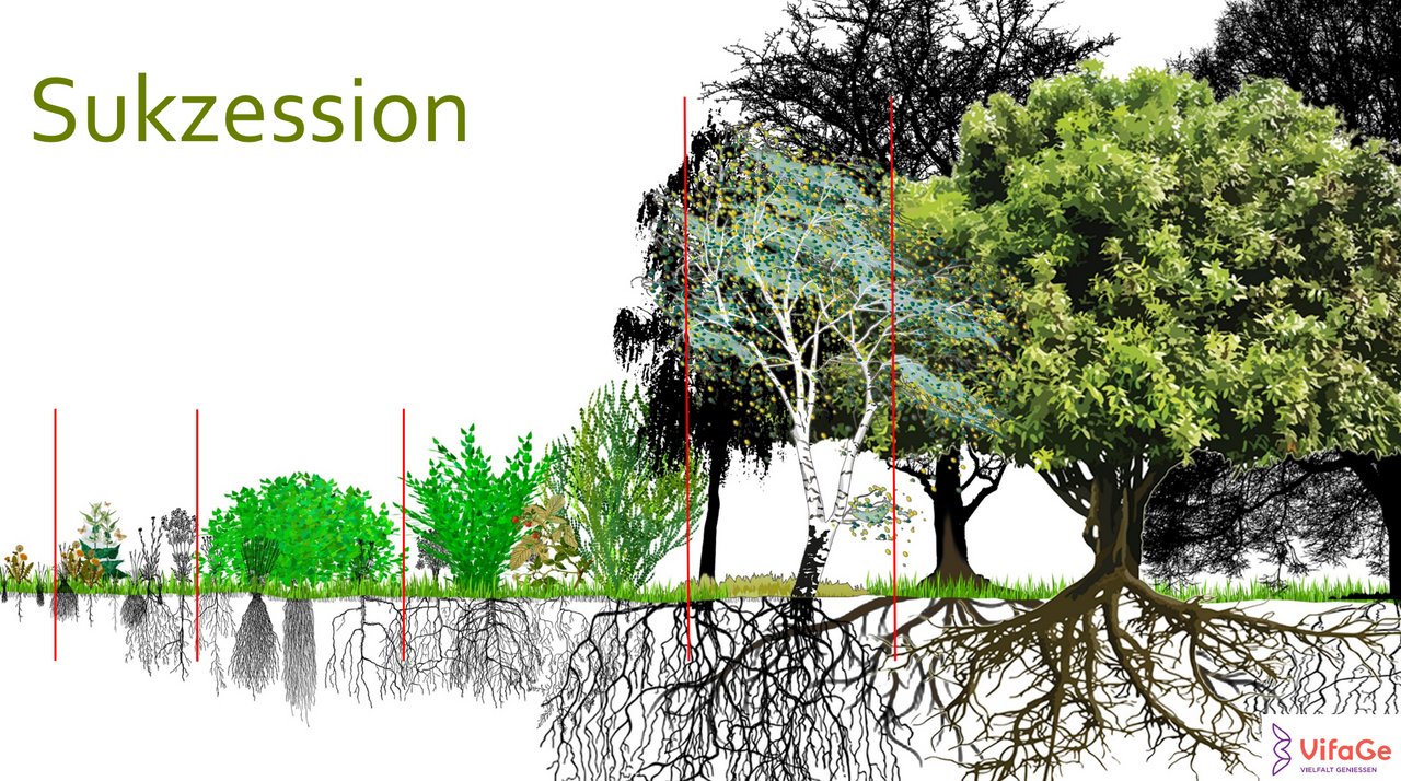 Bei der Entwicklung unserer Pflanzkonzepte berücksichtigen wir das natürliche Wachstumsverhalten der Vegetation, die sogenannte Sukzession. Im ursprünglichen Zustand war Deutschland, wie ganz Mitteleuropa, unter den gegenwärtigen klimatischen Verhältnissen fast ausschließlich bewaldet. Diesem Zustand würden kahle Flächen auch heute wieder entgegenstreben, vorausgesetzt es wären keine Tiere vorhanden, die den Prozess störten. Typischerweise bildet sich ein Wald nicht sofort neu, sondern es folgen verschiedene Sukzessionsstufen aufeinander, mit für die Stufen und den Standort charakteristischen Pflanzengesellschaften. Jede Stufe bereitet den Boden und das Mikroklima für die folgenden Pflanzen vor. Mit der Steigerung der Sukzessionsstufen nimmt auch die Biomasse und damit gleichzeitig die Kohlenstoffdioxid (CO2) Bindung zu. Das gilt für den oberirdischen Bereich (Holz, Blätter, Blüten, Früchte), aber umso mehr auch für den für uns unsichtbaren und damit oft vergessenen, unterirdischen Bereich (Wurzeln, Pilze, Mikrobiom). Auf einer kahlen Fläche würde nach etwa 150 Jahren ein Wald entstehen.